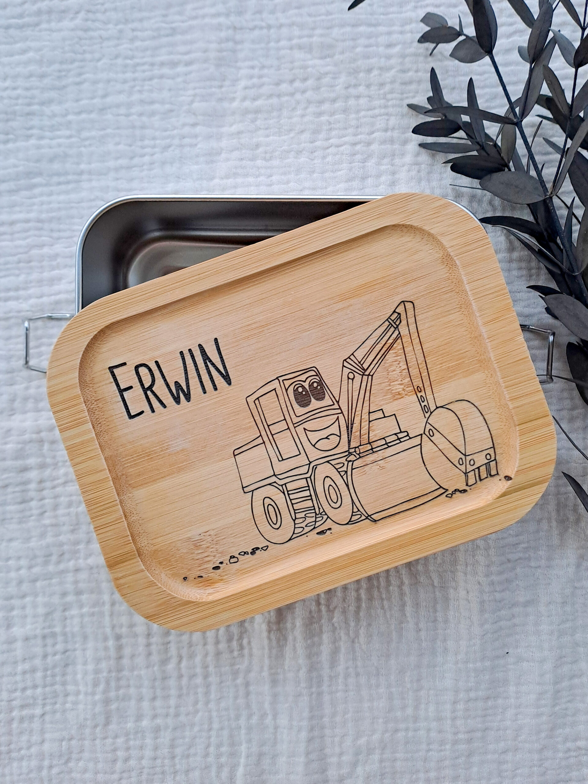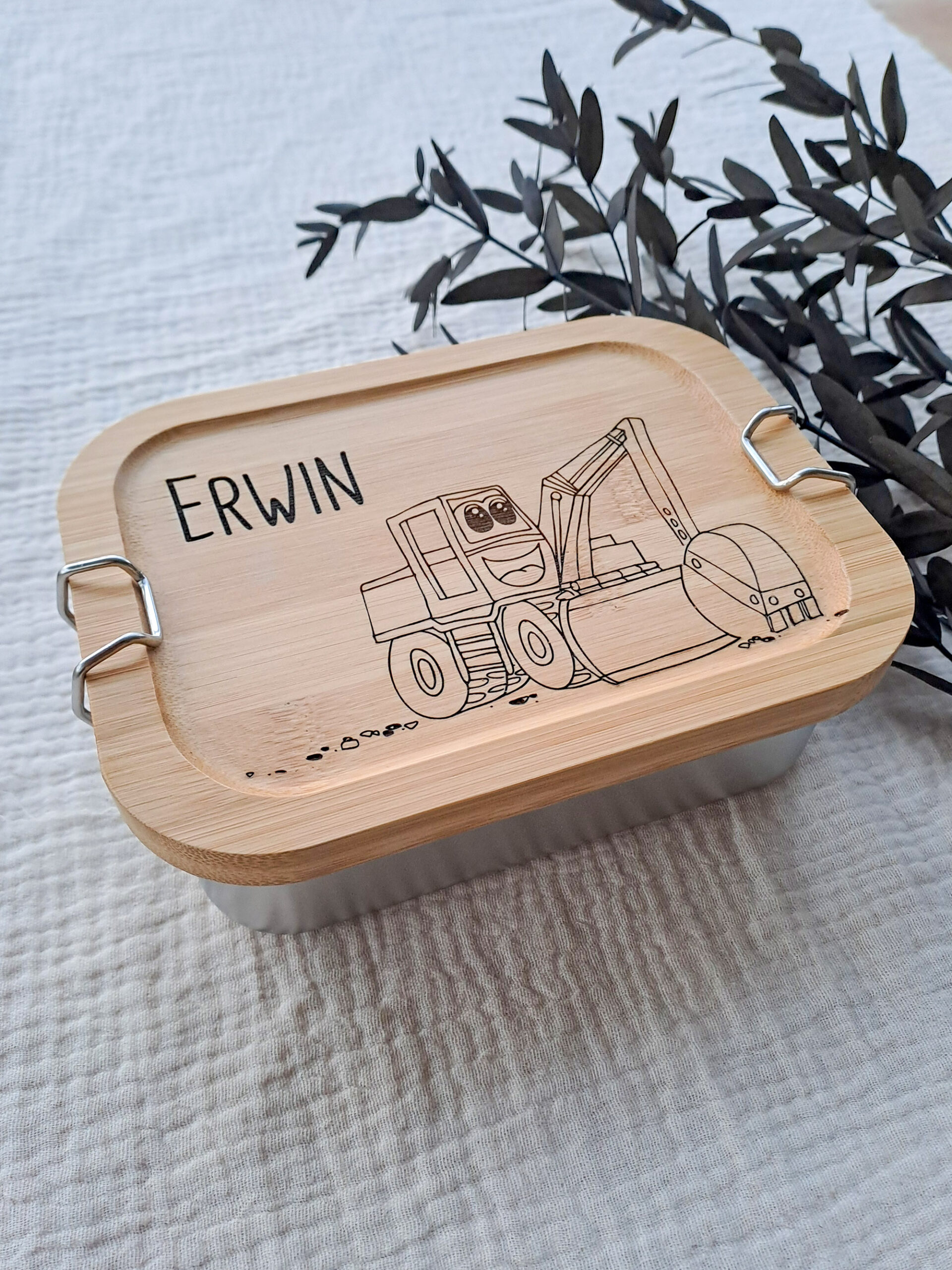 Die Box aus Edelstahl besitzt einen hochwertigen Deckel aus Bambus, auf dem wir deinen Wunsch‑Namen sowie ein zauberhaftes Bagger-Motiv gravieren. So wird jede Znünibox zu einem ganz persönlichen Unikat — perfekt für Kinder, Jugendliche oder alle, die ein bisschen Magie im Alltag lieben.