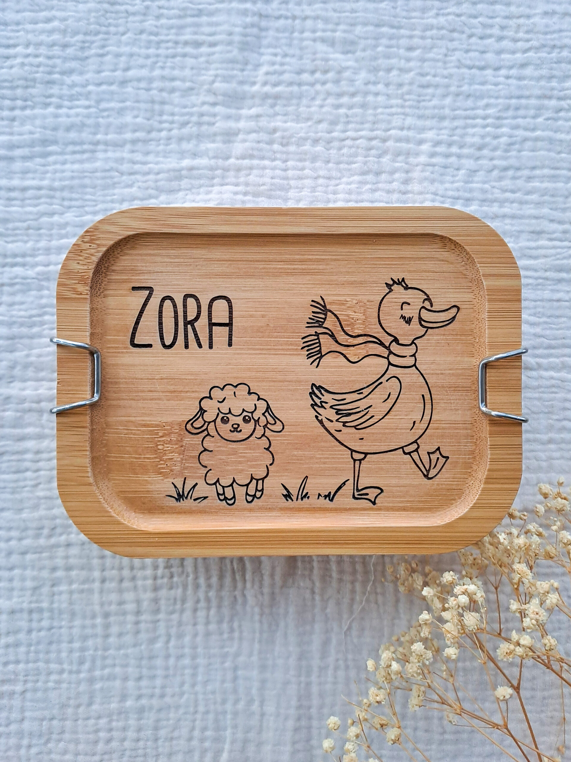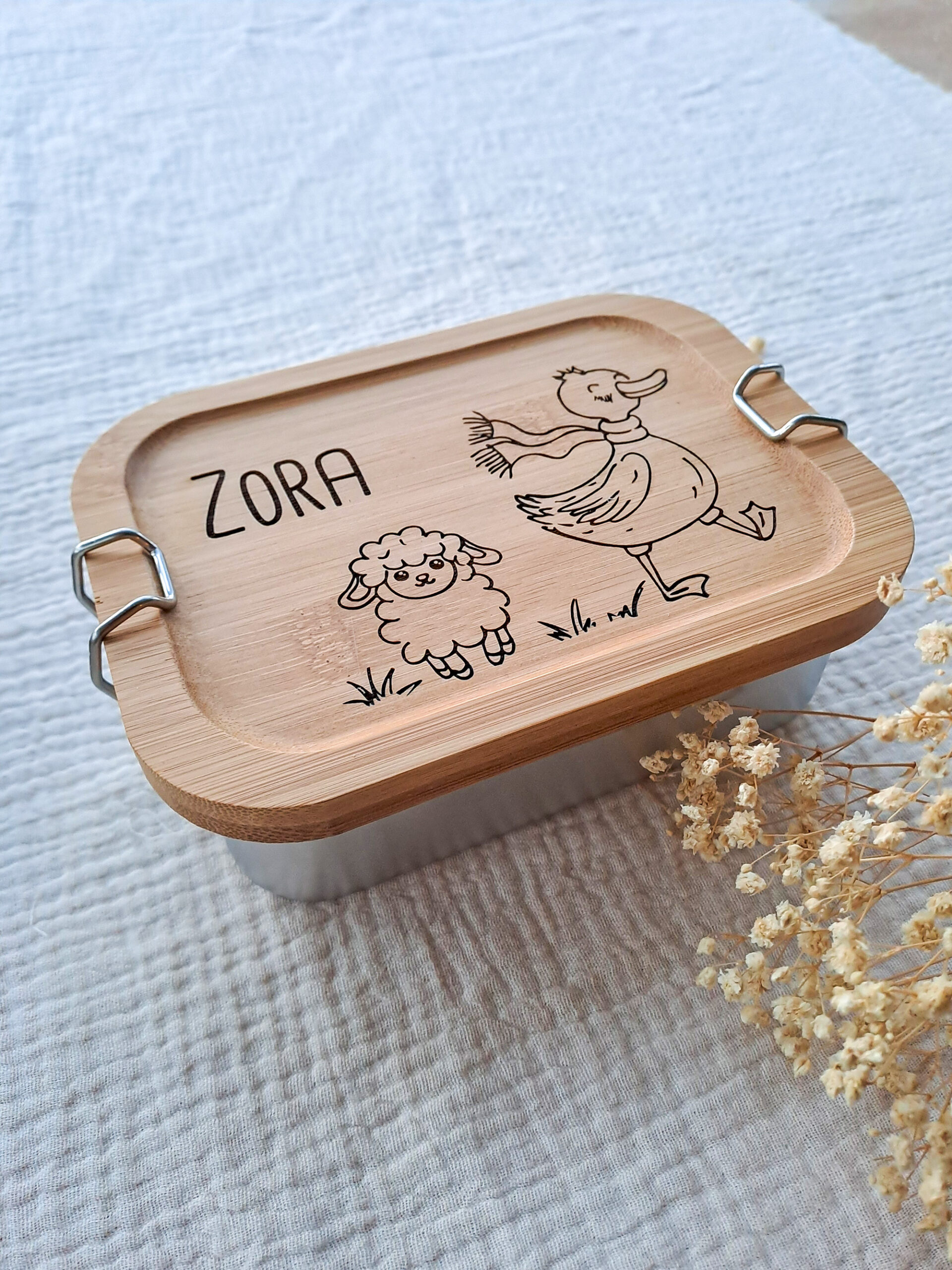 Die Box aus Edelstahl besitzt einen hochwertigen Deckel aus Bambus, auf dem wir deinen Wunsch‑Namen sowie ein zauberhaftes Motiv mit Ente und Schaf gravieren. So wird jede Znünibox zu einem ganz persönlichen Unikat — perfekt für Kinder, Jugendliche oder alle, die ein bisschen Magie im Alltag lieben.